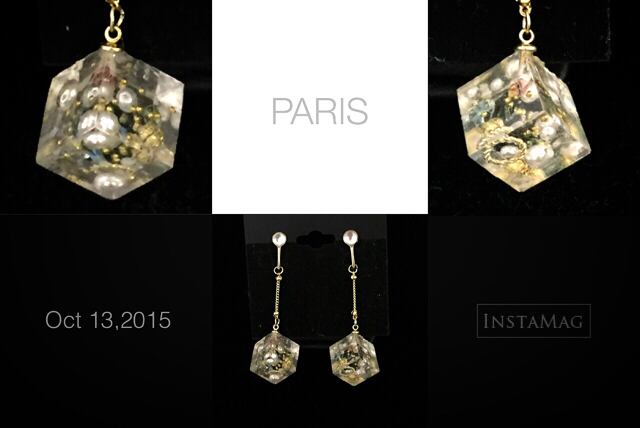 透明のキューブの中にパールやリングなどが散りばめられたピアス・イヤリング。